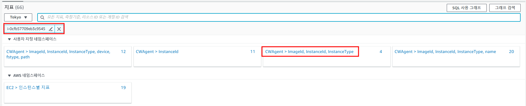 수집할 EC2 ID를 검색해 줍니다 > CWAgent > "Imageld, Instanceid, InstanceType"을 선택해 줍니다.