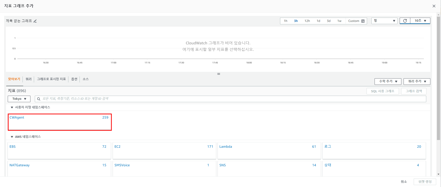 대시보드를 생성하면 빈 그래프가 생성되는데 네임스페이스에 보시면 CWAgent가 우리가 EC2에 설치한 Cloudwatch Agent 입니다.