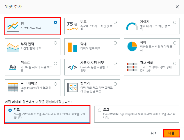 위젯추가는 자신이 원하는 그래프 타입을 선택해 주시면 됩니다.