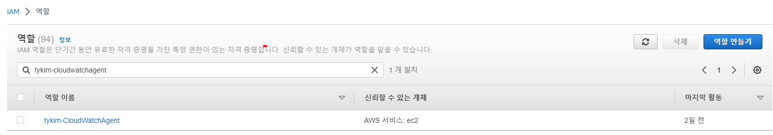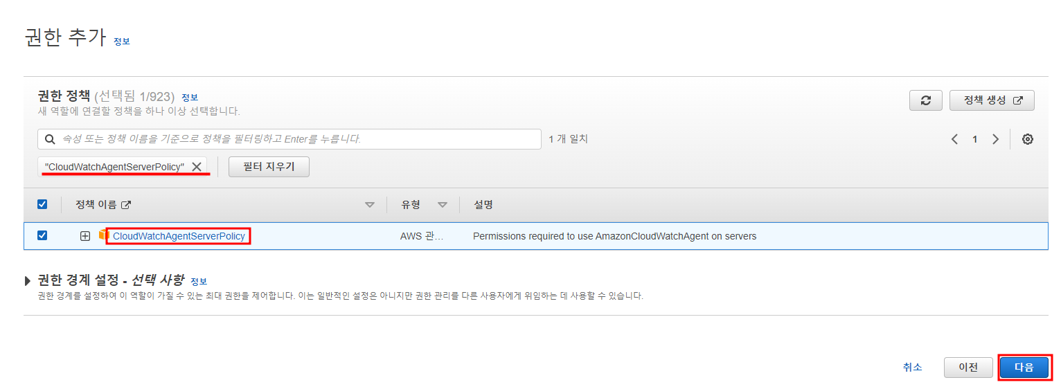 >"CloudWatchAgentServerPolicy"를 검색해서 해당 정책을 추가해줍니다.