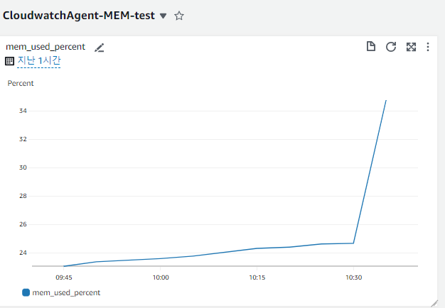 메모리에 부하를 줬더니 Cloudwatch가 지표를 수집해서 그래프가 상승하는 것을 볼 수 있습니다.
